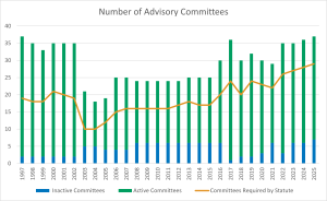 During President Trump’s first term, the U.S. Department of Transportation expanded the number of active FACs in his first year in office and in 2018 the Department more than tripled the average amount of annual spending on committee meetings for federal advisory committees, spending more than $16 million on FAC meetings that year. However in 2019 President Trump signaled an interest in pulling back on advisory committee work, issuing Executive Order 13875 on Evaluating and Improving the Utility of Federal Advisory Committees, which direct agencies to review their needs for advisory committees and terminate at least one-third of the current committees not mandated by statute. According to data on GSA’s FACA database, the number of active FACs declined following that EO, from 30 active FACs at USDOT to 27 in 2020. The number of FACs required by statute has also grown steadily at USDOT, rising from 10 in 2003 to 29 in 2025.