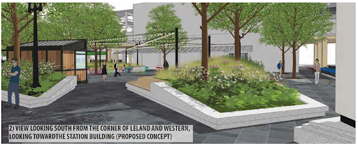 The station area includes a series of disjointed spaces, including the transit plaza, a surface parking lot (used for farmers’ markets), a linear walkway under the “L” tracks, and Leland Avenue. Neighbors called for improvements to these areas during the master plan process.