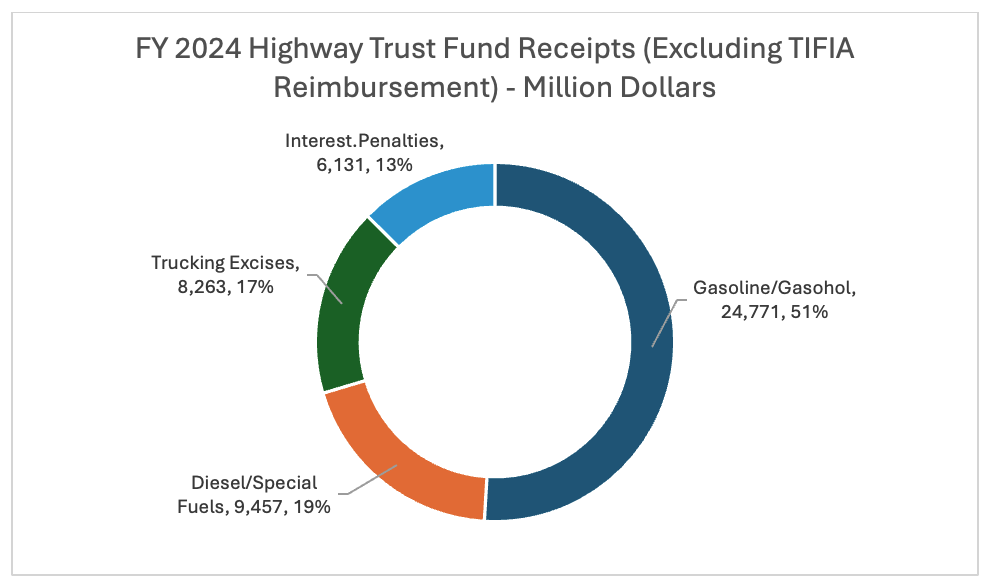 From its inception on July 1, 1956 through September 30, 2024, the Trust Fund has received $1.401 trillion in net tax receipts from federal excise taxes on highway users and has paid $1.615 trillion in outlays for federal highway, mass transit, highway safety, and motor carrier safety programs. The gap between the two numbers has been filled by periodic transfers of general revenues by Act of Congress (since 2008), interest paid by the Treasury Department to itself on accumulated balances, and a small amount of fines and penalties for highway and truck safety and highway tax evasion offenses.