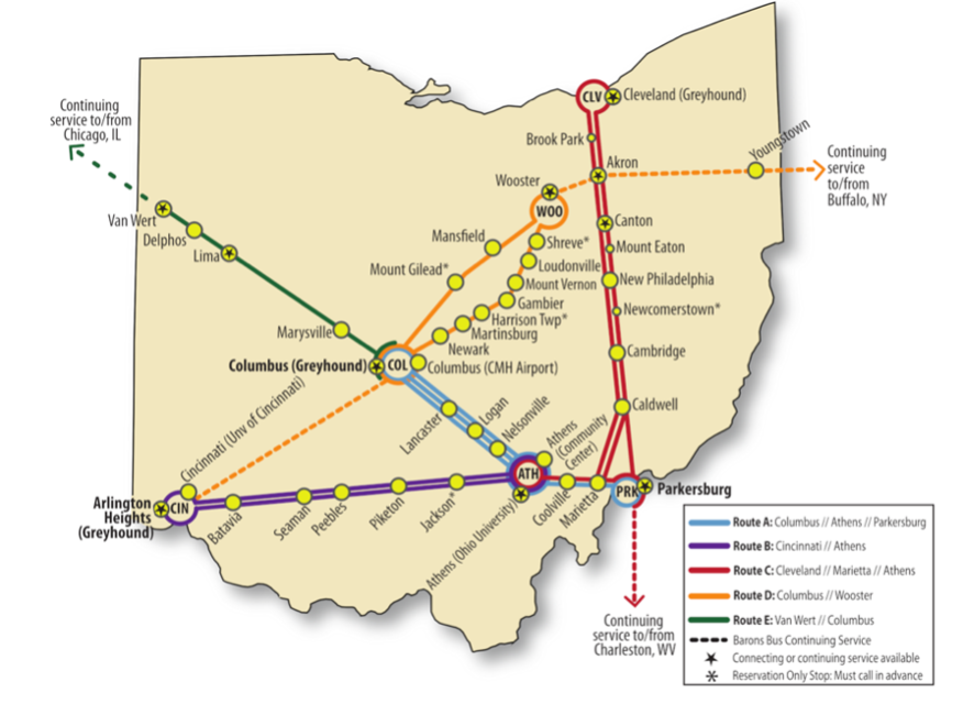 Ohio Go Bus. The Buckeye State’s DOT uses federal dollars to operate bus lines designed to link “cities and rural areas in the state of Ohio…and connect with national bus lines” to external destinations like Pittsburgh, Buffalo and Chicago. Segments are operated by private companies who win a competitive bidding process.