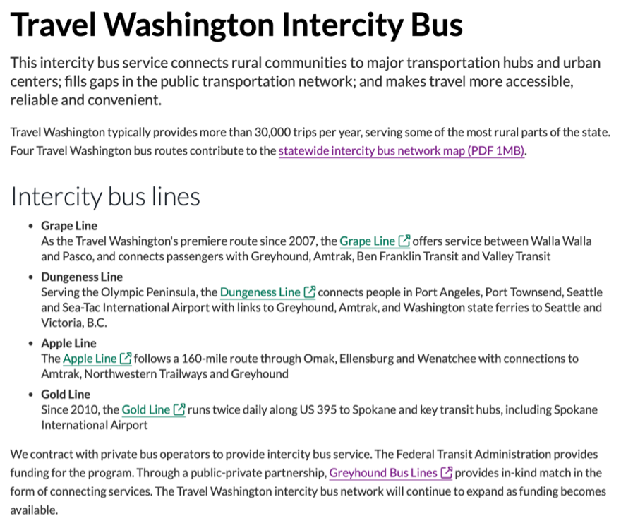 Travel Washington Intercity Bus. Washington State DOT conducts extensive public outreach and market surveys to determine where the public subsidies for medium-distance bus lines should be spent to have the greatest positive impact on Washingtonians’ access and mobility.