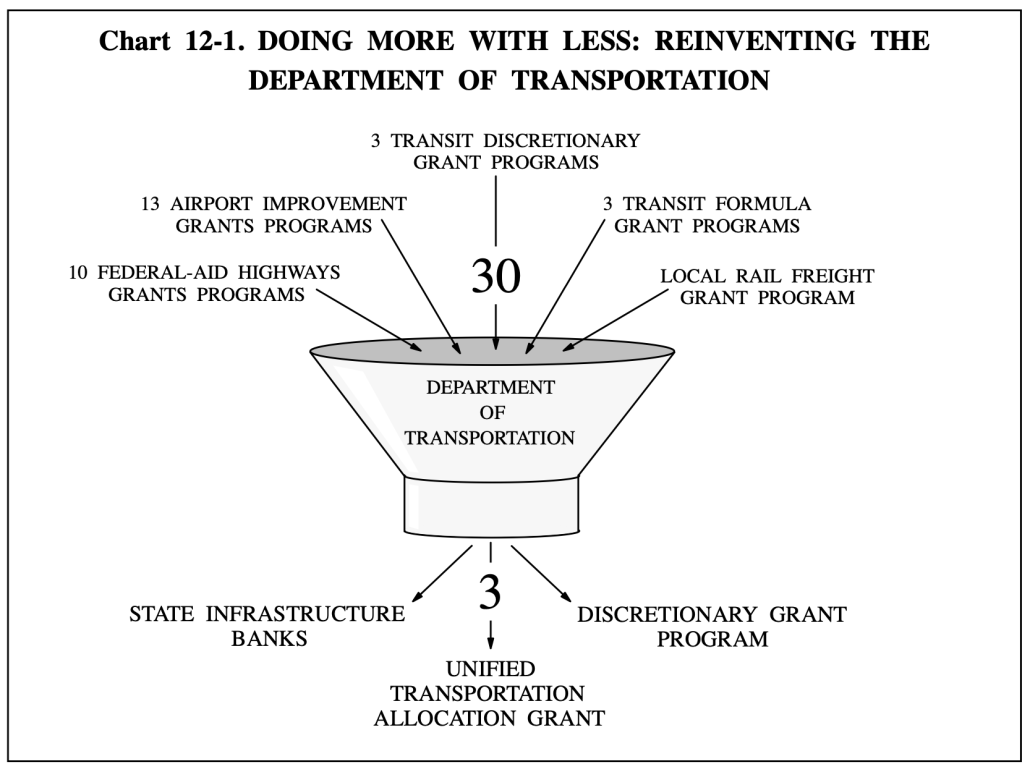 As we await a Transportation Department reorganization plan, it will be useful to take a quick look at how USDOT is organized, and a closer look at just how radical the Clinton Administration’s proposed reorganization plan was, 30 years ago this month.