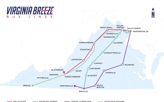 A map of the state-administered Virginia Breeze intercity bus service, which launched in 2019 and has since expanded to four lines.