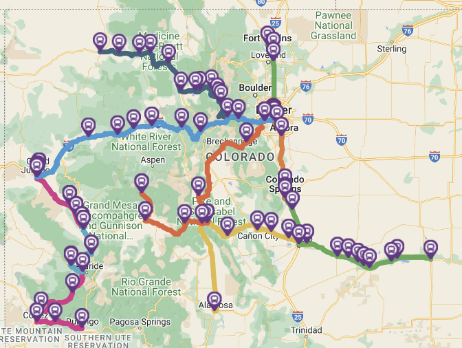 Bustang, a Colorado Department of Transportation-managed service operating since 2015, runs three main routes to connect the state’s largest cities and attractions. Two routes traverse the oft-congested north-south I-25 corridor — one to the north of Denver, connecting the capital city with Fort Collins, and another to the south between Denver and Colorado Springs — and a third, farther-reaching east-west line runs 243 miles along I-70 between Denver and Grand Junction (see map below).