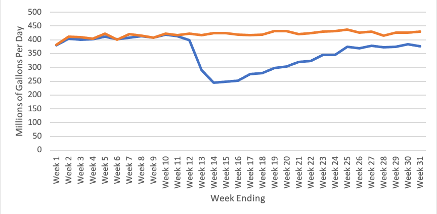 August 5, 2020 – The latest weekly production reports from the Energy Department show that the production of gasoline by U.S. refineries and blenders has stabilized at a level around 12 percent below last year’s production levels.