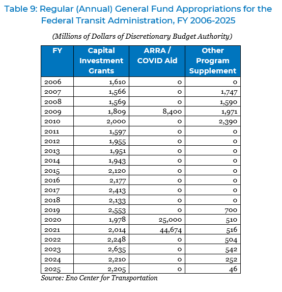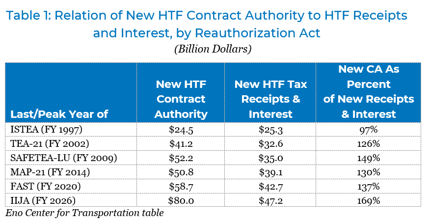 The source of revenues for these programs is critical because unlike programs that rely on annual appropriations, highway and transit programs are funded with contract authority from the Highway Trust Fund. Contract authority is a form of budget authority that confers many advantages; specifically, contract authority is considered mandatory spending, rather than discretionary, and therefore the cospending from the HTF does not need to compete with other spending accounts and priorities within the Transportation Housing and Urban Development (THUD) appropriation bill’s limits on discretionary spending (referred to as 302(b) suballocations). However contract authority is reserved for funding that originates from a trust fund with dedicated revenues. And without a decision for how to restore solvency, the trust fund has become steadily underfunded, such that it may become difficult to defend the use of that prioritized form of budget authority. No decision is also a form of decision, and before long the country may arrive at a point where eliminating contract authority or another onerous outcome is the only choice remaining.