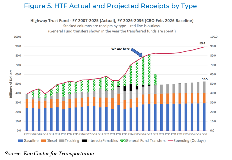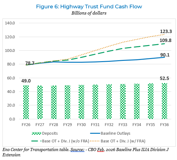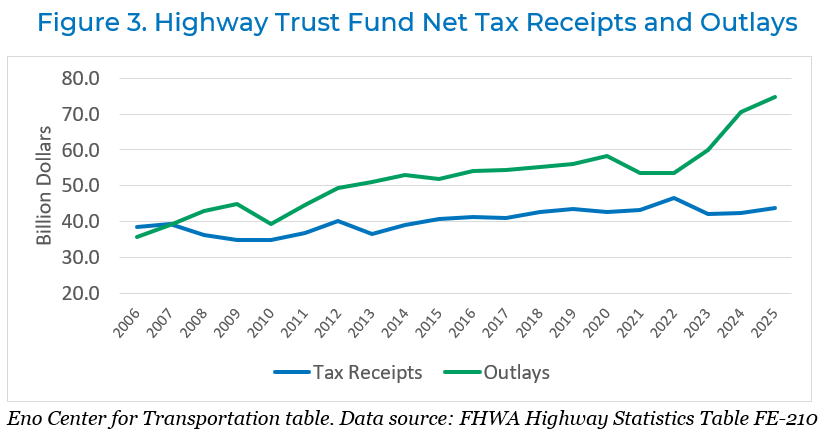 Finally, there is the option to continue down the path of insolvency and for Congress to continue using the General Fund to support transportation programs, as has been done for the last 20 years now. Congress has steadily increased funding levels beyond revenues while also avoiding new taxes, and the de facto “solution” to enable this has been to backfill the shortfall with steadily larger transfers from the General Fund. This has taken the transportation programs to the point where in 2026, the receipts into the HTF will cover just 60 percent of its spending and that gap will continue to widen. In recent years, Congress has further expanded the amount of transportation spending outside of the HTF, in both annual appropriations laws and in a five-year advance appropriation in the Infrastructure Investment and Jobs Act (IIJA), which was designated as emergency spending.
