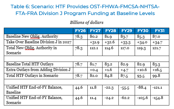 [1] Specifically, as of August 2025, USDOT had a total of $86 billion in outstanding HTF obligations of funds made available by the IIJA and previous acts ($66.7 billion for the highway account and $17.4 billion for the mass transit account and approximately another billion each from National Highway Traffic Safety Administration (NHTSA) and the Federal Motor Carrier Safety Administration (FMCSA)).