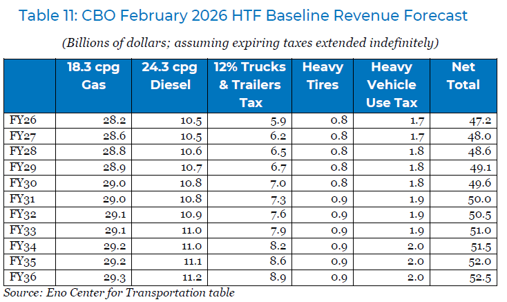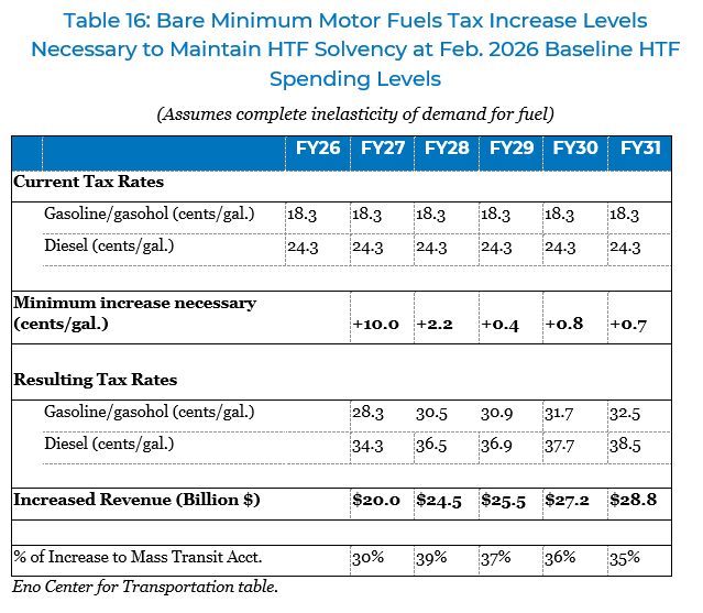 Congress can cut spending down to current revenues—although the path for that is already impossible for the transit account on its own, which could be cut to zero new spending and still require four years of current transit account revenues just to pay out the obligations from prior years. But by rebalancing the distribution between the highway and transit account, and cutting all new transit and highway authorizations by half, Congress could achieve Highway Trust Fund (HTF) solvency with no new revenue.